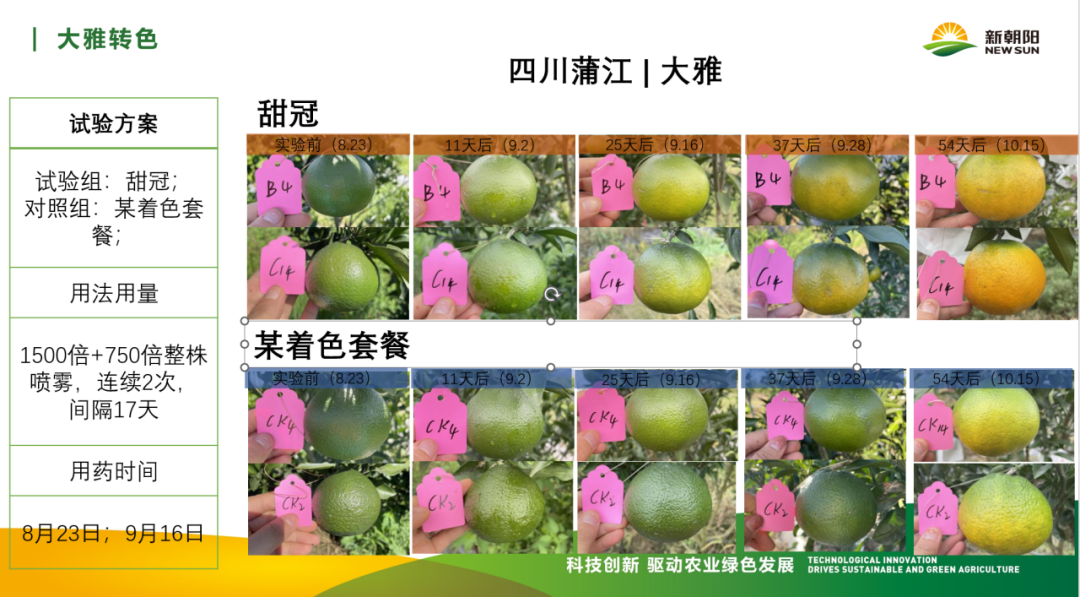 甜冠(冠菌素)適用于各類柑橘品種,如愛媛、金秋砂糖橘、砂糖橘、冰糖橙、金桔、沃柑、耙耙柑、不知火等。促進果實轉色、顏色紅潤,表皮靚麗,提升干物質積累,如提升糖度、芳香味物質積累,提高果實品質,提前上市,提升抗逆性,延長果實留樹保鮮和果實貨架期,減少流通環節損耗。